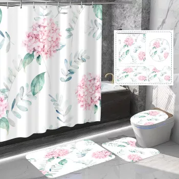 Pink Embroidered Ball & Green Leaf Shower Curtain Set with Bath Mats & Hooks